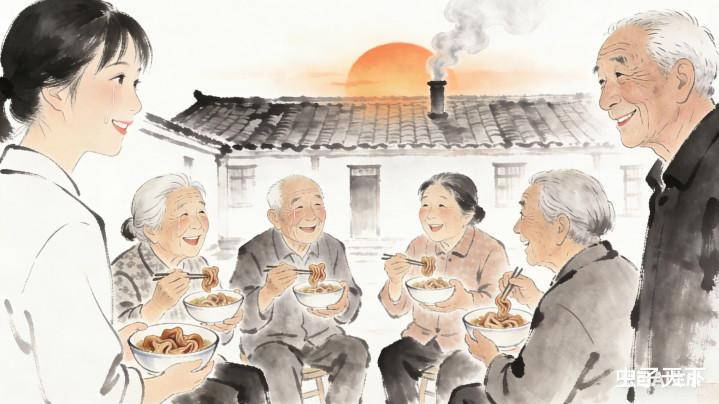 老人们一边吃,一边聊当年古镇的趣事,聊陈婆婆的好,院子里的哭声渐渐变成了笑声。